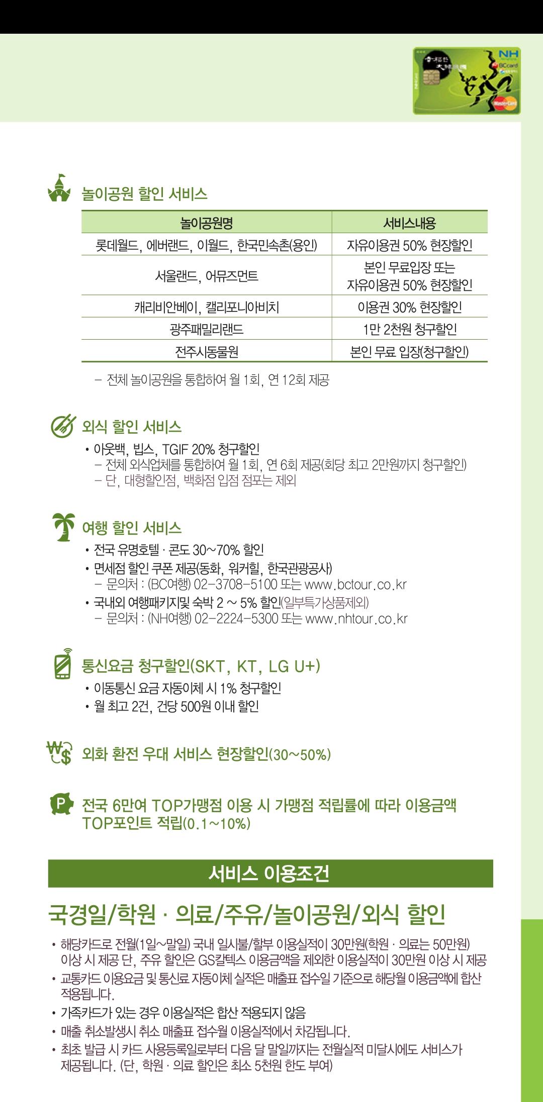 특징은 국경일에 할인 및 적립이니 이날에 맞춰서 쓰실 분에게 가장 어울릴꺼 같은 상품이네요. 혜택 전부 전월실적 30만원이상 넘어야 하고요,(학원 및 의료업종은 최소 50만원 이상) 선풍기는 실적만 인정된다는거 참조 하시기 바라며 이 상품은 오래된 상품이라 농협은행 내방신청만 가능하다는점 양해바랍니다.(참고로 체크버젼이 있는데 국경일 할인 및 적립이 신용기준에서 반토막이며 그 외 혜택이 GS칼텍스 및 여행 달랑 2개밖에 없네요. 단, 인터넷이나 앱상에서 신청가능하니 참고바래요.)