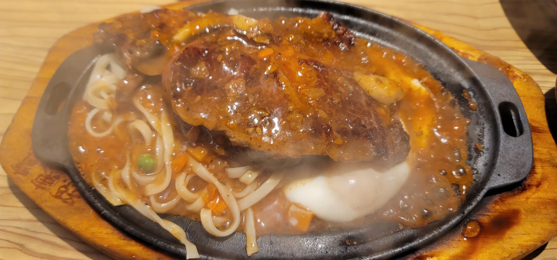 그리고 지글지글한 철판위에 계란하나가 반숙 후라이 상태로 나옵니다.