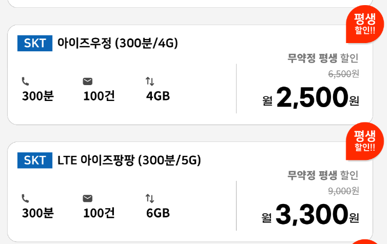 2500원짜리는 프리티상품과 비슷한데 차이점은 프리티은 통화량이 350분이고