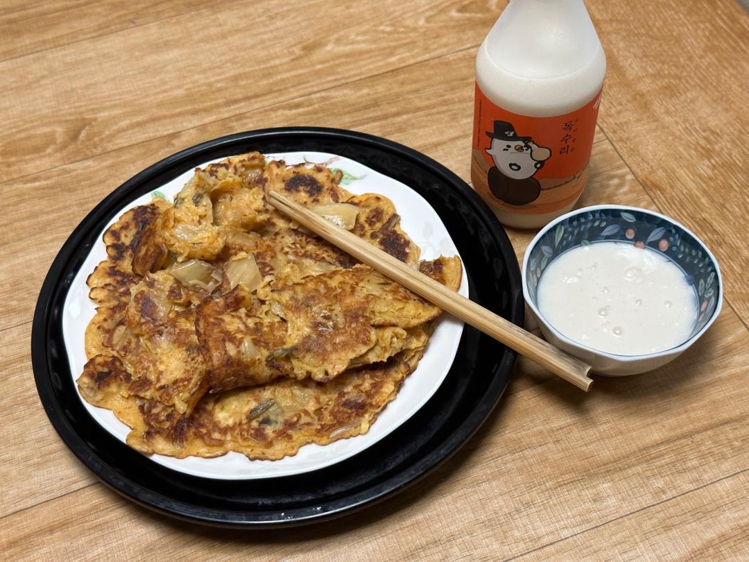 비오니 김치전에 얻어온 막걸리를 먹으면 딱이겠네 해서