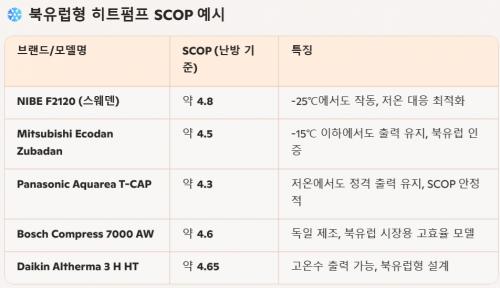 이것조차도 조금 지난 이야기구요. 최신제품들 SCOP를 찾아보면, -15도에서도 정격출력을 유지하는 북유럽형 히트펌프의 숫자가 상당해요. 작동가능을 기준으로 할 경우에는 –30도에서도 작동하는 애들도 많구요. (-30도까지 작동이 보장되는 애의 경우 실제로 작동된 온도는 –33도라고 하더라구요.)