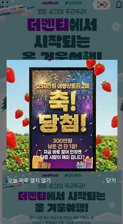 24일까지 딸기 메뉴 주문하면 스탬프 적립도 되고, 모두투어 이벤트도 참여할 있는데, 당첨자 300만원권 이제 명만 남았다고하네요~