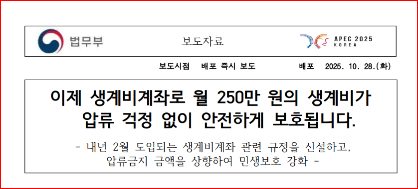 이 계좌는 정부의 직접 지원금이 아니라, 내 통장에 들어온 돈을 월 250만 원까지 압류하지 못하도록 법으로 보호하는 '생계비계좌'입니다.