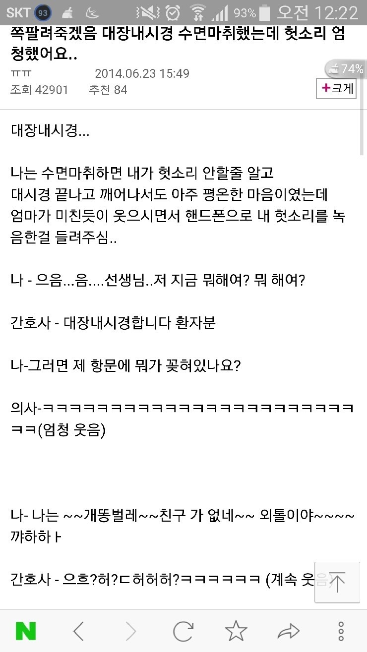 저도 드는 생각이 다음에 수면내시경 할때 핸드폰으로 녹음한번 해볼까 하는 생각이 들더군요. |