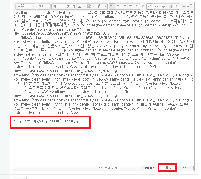 딜바다 에디터로 돌아와서 HTML모드를 먼저 선택하고
