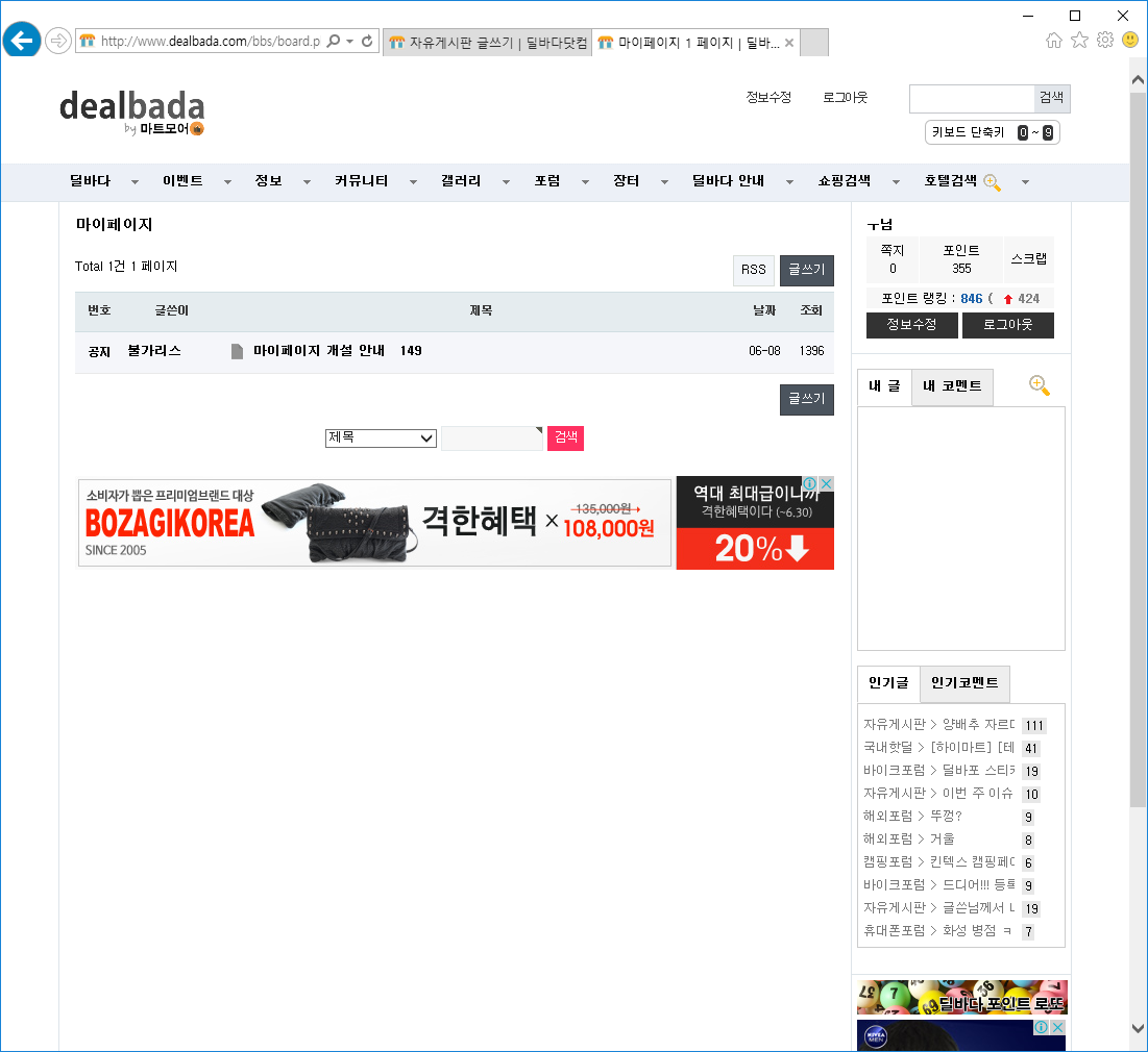 메뉴 딜바다 안내 - 마이페이지 를 이용하시면 글쓰기 전 링크 확인 차