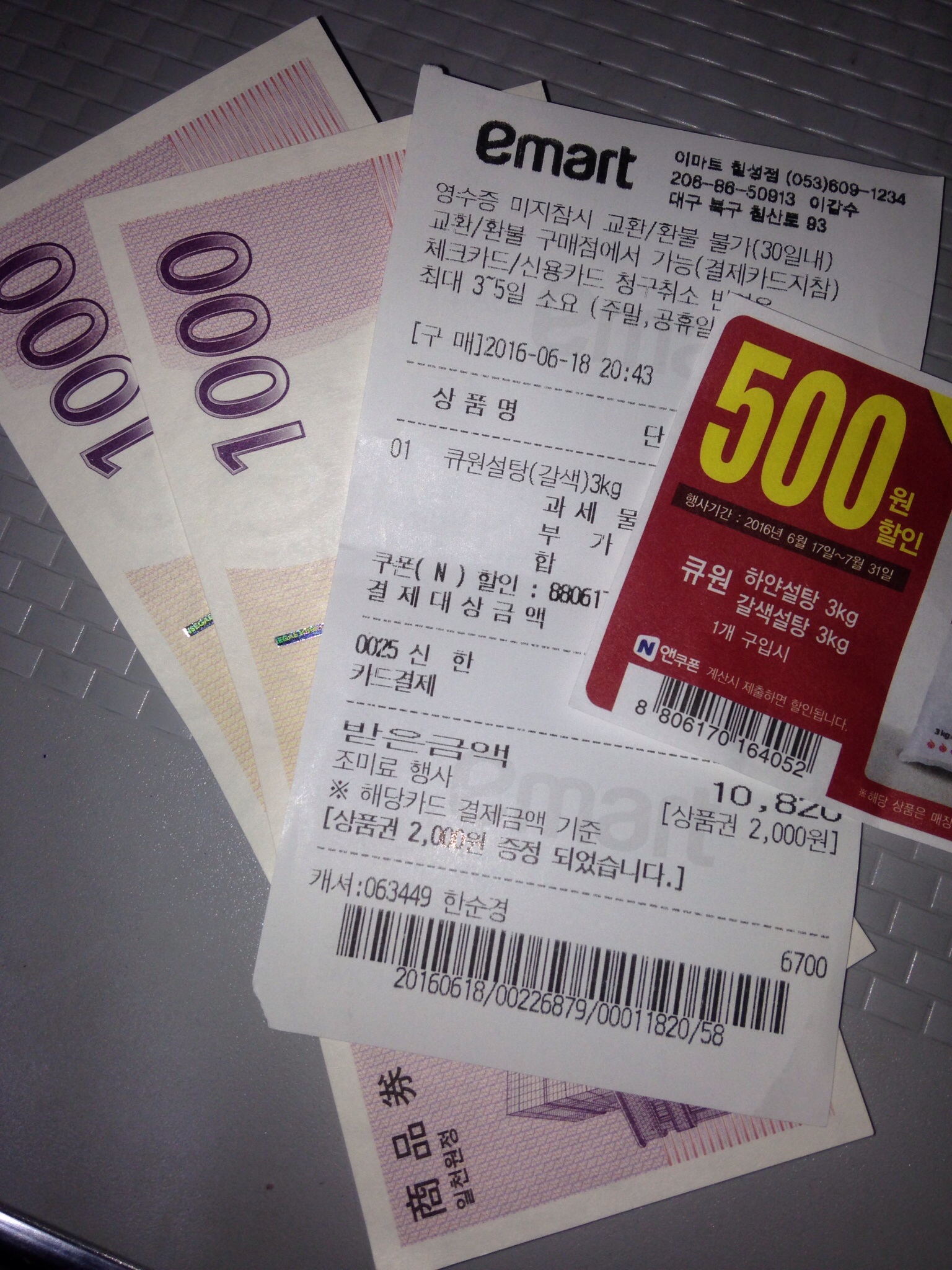 5900원(3kg 한 포대) - 500원(쿠폰할인) - 1000(상품권) = 4400원 정도에 설탕 3kg 1포대를 구입했네요. 캐셔분에게 물어보지는 못 했지만 조미료 행사라고 영수증에 적힌 걸 보면 다른 상품에도 해당이 될 것 같네요.