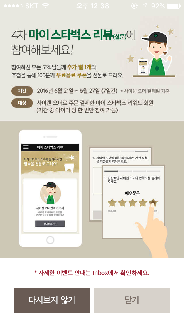 호오 골드 레벨 기준으로 6월 22일 적립된 별 만큼 익일 추가 적립해주는 이벤트를 하던데.. 한잔 마시고 별 4개 얻어야겠네요 ㅎ |