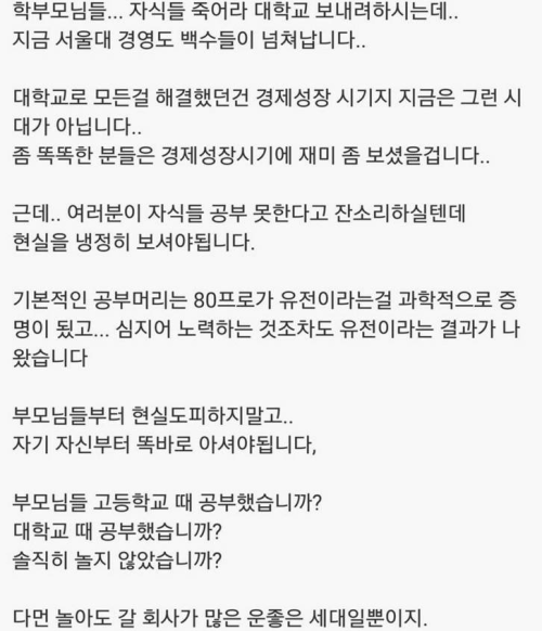 유전이 학업성취도를 50% 결정하는데 나머지 50%를 보고 열심히 밀어넣는거죠 |