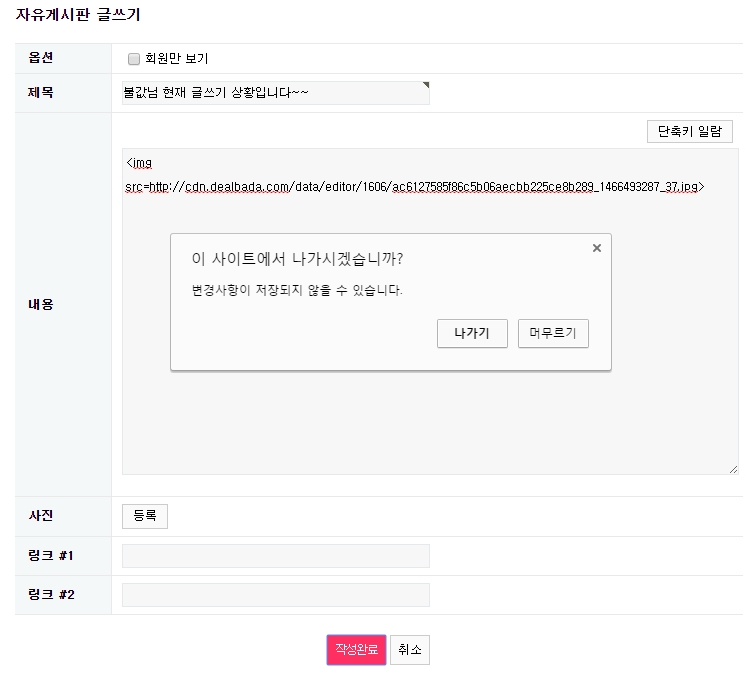나가기를 누르면 글은 써지는데 엔터가 안먹힌 상태로 써지네요;;