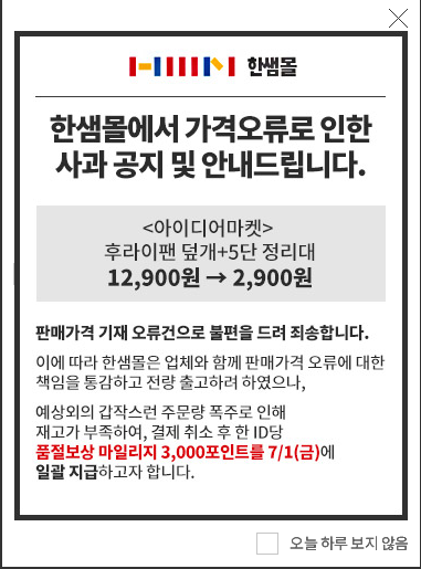 한샘몰에 이런 팝업공지가 올라왔네요.