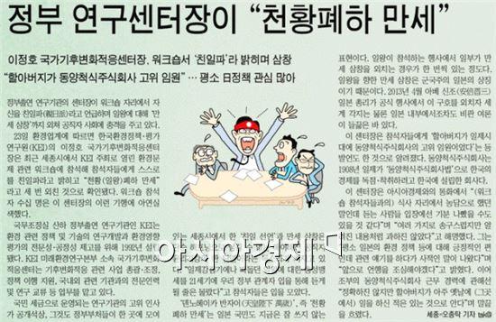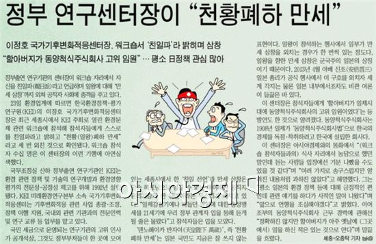자리가 무르익을 무렵 이정호 KEI 국가기후변화적응센터장이 술잔을 들었다. 이날 워크숍을 주최한 기관의 센터장으로서 인사말과 건배사를 하기 위함이었다. 이 센터장은 "나는 친일파(親日派)다" "할아버지가 일제시대에 동양척식주식회사의 마지막 사장이었다" "일본은 어머니의 나라다"라는 등의 발언을 웃으면서 늘어놨다. 참석자들의 얼굴이 굳어졌다. 갑자기 주변 공기가 차가워졌다. 그러나 누구도 이를 제지하지 못했다. 참석자들은 이 센터장이 조직 내에서 승승장구하고 있는 것으로 전해 듣고 있었다.