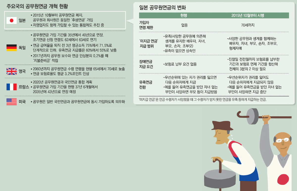 일본은 내년 10월부터 한국의 공무원연금에 해당하는 ‘공제연금’을 없앤다. 그 대신 모든 공무원은 전 국민이 가입하는 국민연금(기초연금)과 일반 회사원이 가입하는 후생연금에 가입해야 한다. 공무원과 일반 회사원의 연금 차별이 사라지고 같은 액수의 보험료를 내는 공무원과 회사원이 퇴직한 후 받는 연금액과 수급 조건이 같아지는 것이다.