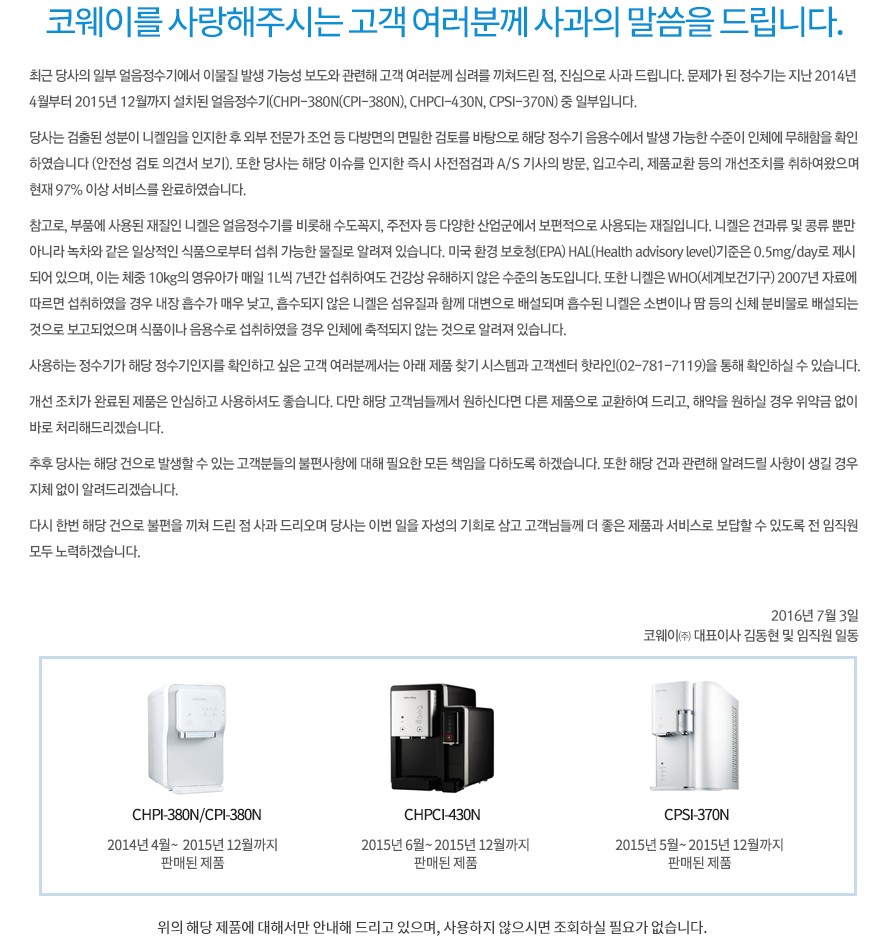 갑자기 코웨이가 실검 순위에 올라서 확인해 보니 이런 사과문이 떴네요