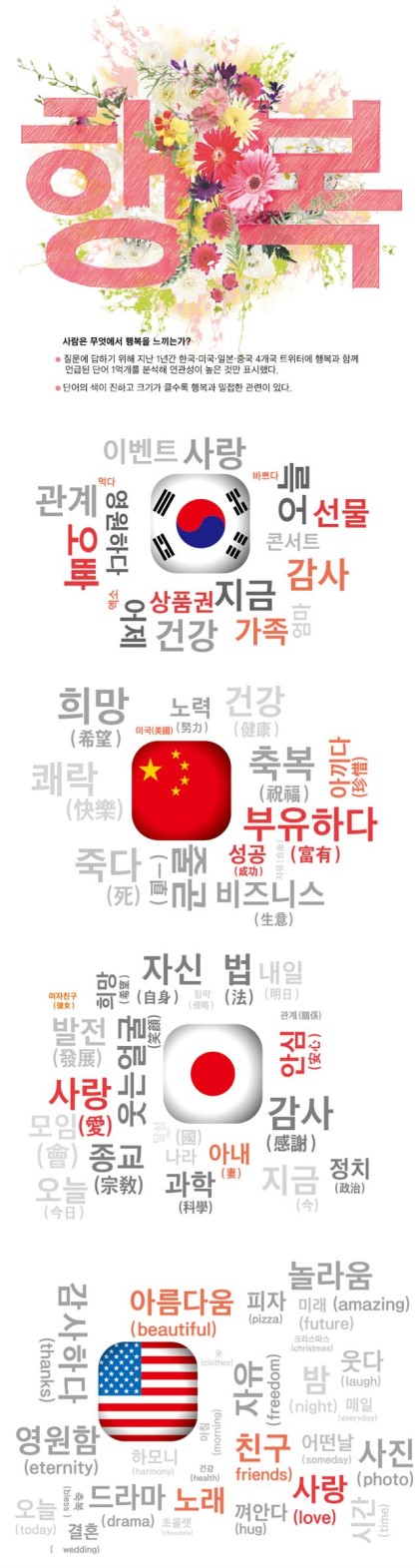 ​9. 韓-中-美-日 빅 데이터로 본 행복 비교 → 한국은 일상서 행복 찾는 미국과 달리 여행 등 일상 탈출서 기쁨 느껴. ‘가족’, 한국과 달리 美, 日선 불행 연관어. 정부 보는 시각은 일본만 긍정적.(한국, 기획 특집)▼각국의 행복 연관어 들