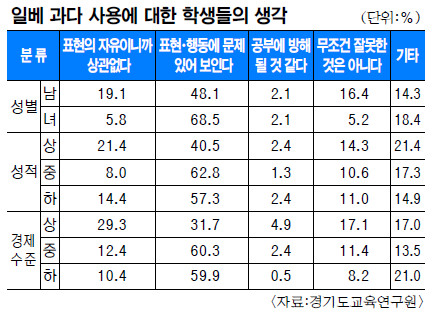 1. 성적과 경제수준이 상위권일수록 ‘일베’에 대한 인지도나 공감도가 상대적으로 높았다 → 중, 하위권보다 항목별 두배 이상 차이도... 경기도교육연구원 보고서 내용 분석.(국민)▼표