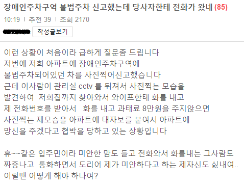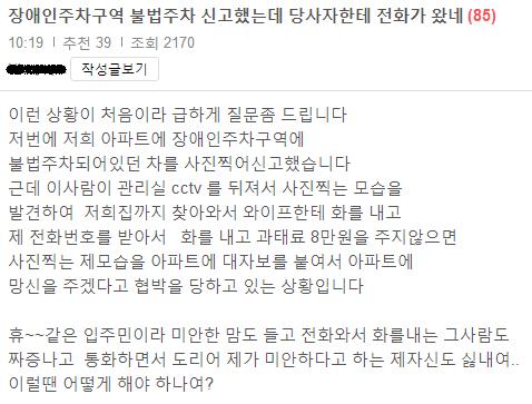 [보배펌] 장애인주차구역 불법주차 신고했는데 당사자한테 전화가 왔네