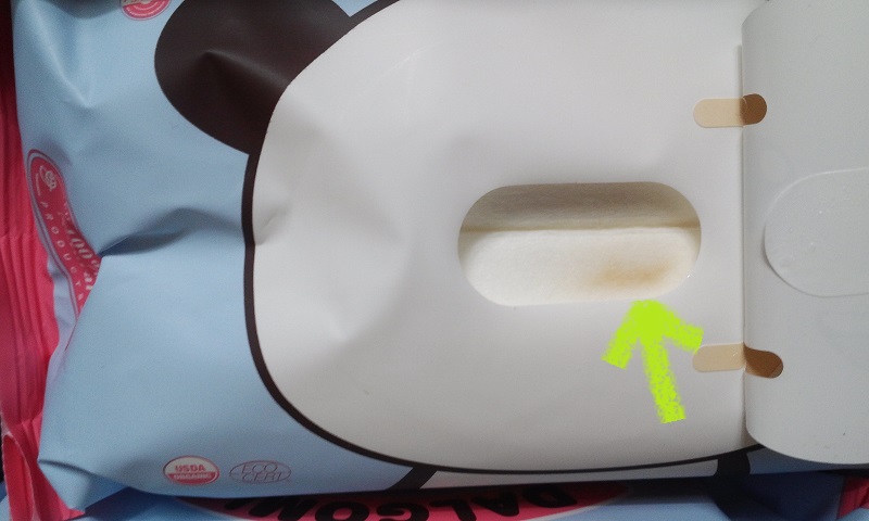 뚜껑 여니깐 물티슈가 뭔가 노란색으로 달라진 부분이 보이고