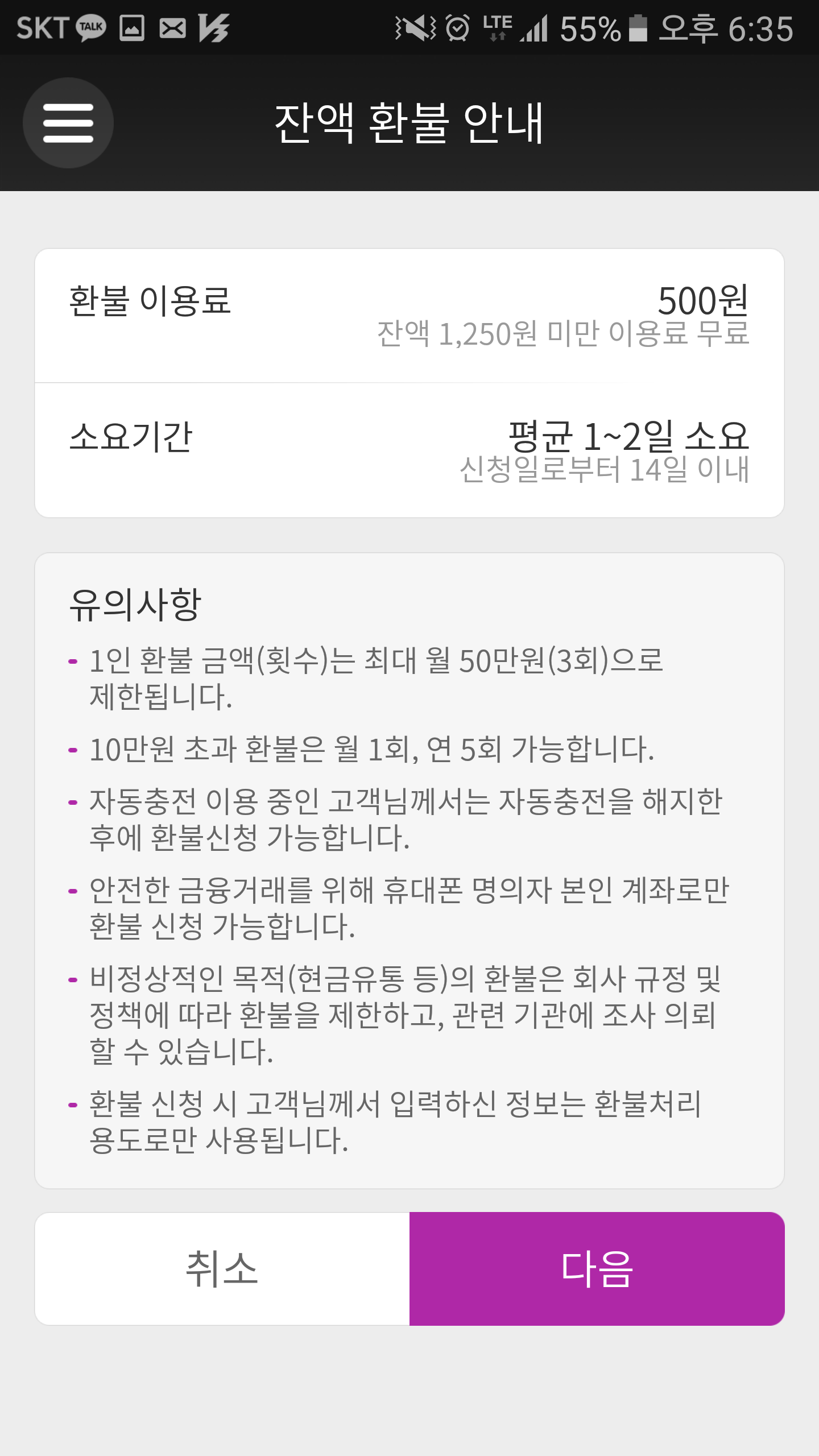 최대 50만원까지 충전 가능하니 50만원까지 충전하고 환불하기하면 500원 수수료내고 환불받을수 잇어용.
