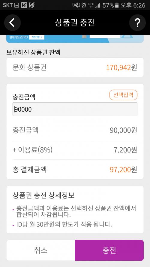 8%조금 안되는 수수료를 내고 충전할 수 있습니다.
