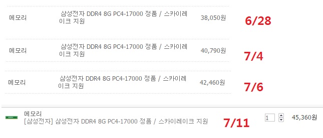 그나저나 램값은 진짜 쭉쭉 오르고있네요; 5월말 6월초에만 해도 3만원 초중반이였는데;
