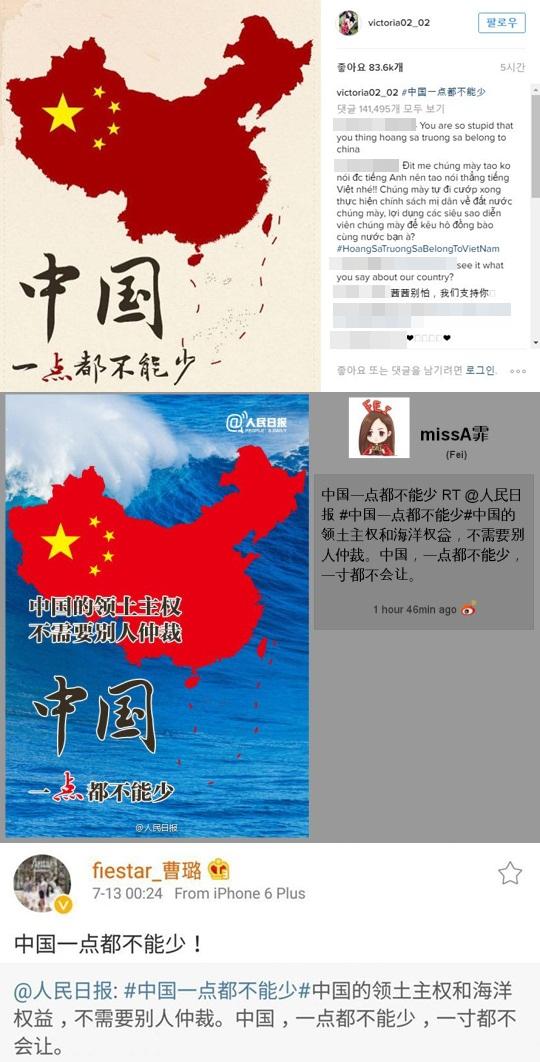 중국인 연예인 빅토리아, 페이, 차오루가 SNS를 통해 남중국해 분쟁에 의견을 나타냈다.