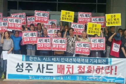 전북지역 시민사회단체들로 구성된 사드 한국배치 반대 전북대책위원회는 14일 오전 11시 전북도청 앞에서 기자회견을 갖고 사드 성주배치 결정 철회를 촉구했다.