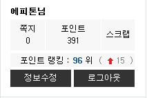 축하드려요! 저도 100등 안에 든게 엊그제 같은데 요샌 포인트가 뭐라고 어느새 집착하고 있어요 ㅎㅎ | ||