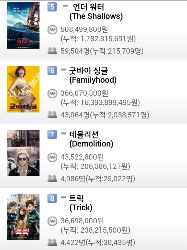 나우유씨미는 저리 뜰만한 영화같지 않은데 많이들 보네요. 김선달도 마찬가지고... 딱히 대작이 없어서 그런가 싶네요. 언더워터는 나름 볼만하고 트릭은 재미있던데 영 못뜨는군요. 아이인더스카이는 올해 본 영화중에 손꼽는 영화인데 순위권에 아예 없네요. 데몰리션은 봐야하는데 상영관이 거의 없어서 시간 맞추기가 힘드네용.