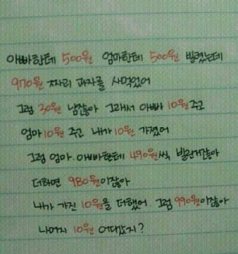 980원빌렸고 난 10원있어 그거 5원씩갚아 그럼 970원이니까 과자값나왔네 과자갚만갚아이제그럼돼 |