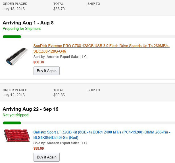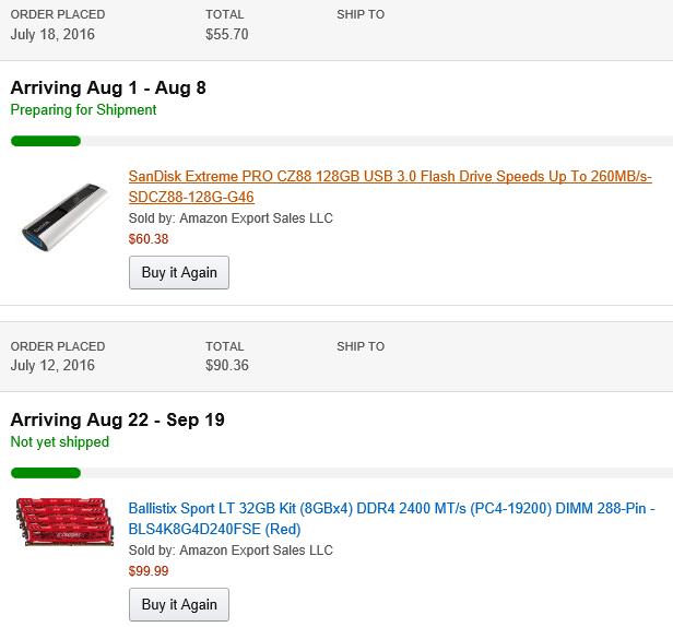 아마존은 프라임 데이때 산 메모리는 아직 아무런 변화가 없던데 35달러 이상 10달러 할인해주길래 산 usb 메모리가 뜬금없이 결제되서 배송준비중이네요..