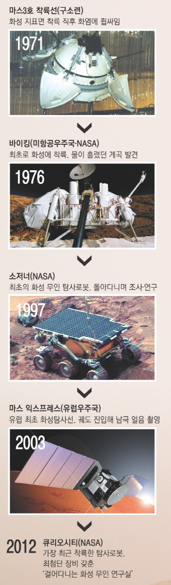 *지구와 닮은 화성 : 대기의 주성분은 이산화탄소지만 최고온도 35도에 자전주기도 지구의 1.02배, 자전축의 기울기도 25.19도로 지구(23.4도)와 비슷해 지구처럼 계절이 바뀐다. 중력은 0.38배 정도