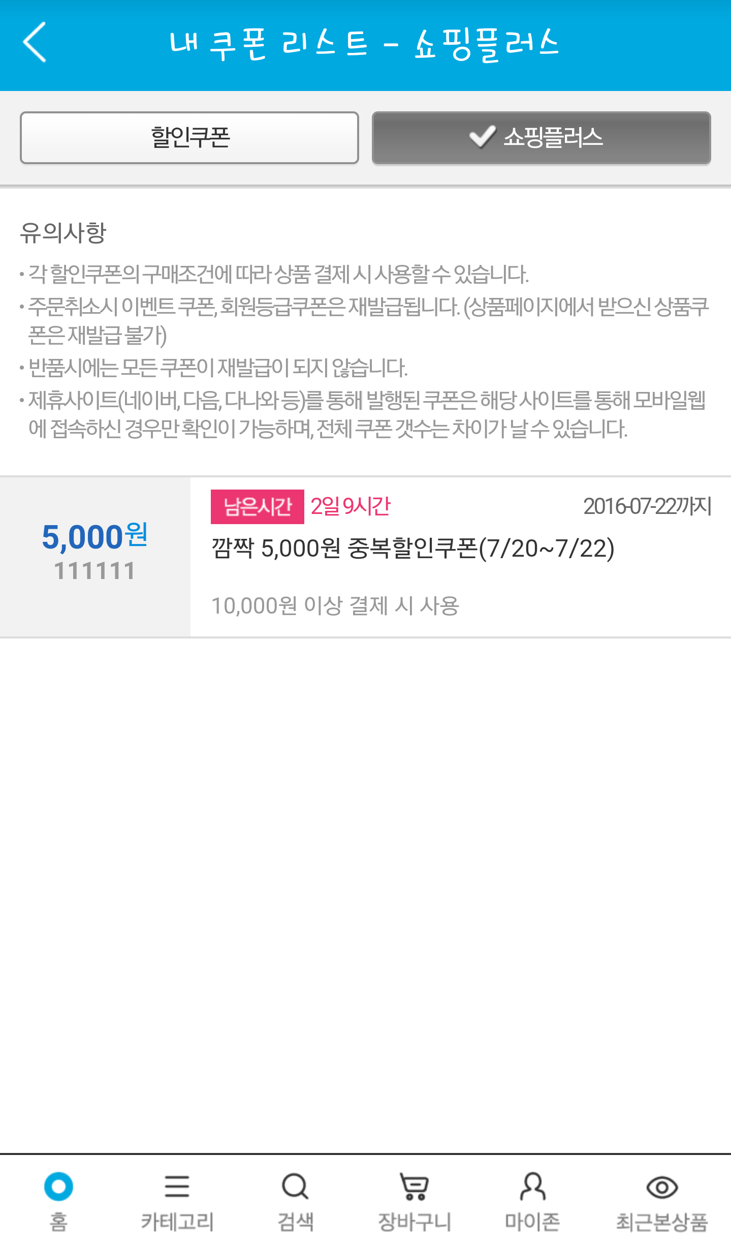 지금 확인해 보니까 5월달에 만원 이상 5천원 쿠폰을 한번 지급한 적이 있었네요. 대상은 작년에 구매내역있고 올해는 없는 사람이었네요.