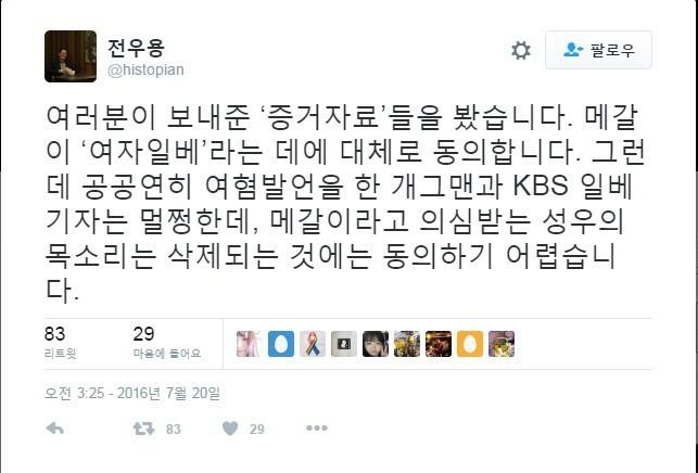 저도 새벽에 보고 벙쩟네요. 일베기자는 멀쩡한데 메갈성우는 왜 삭제되냐니 저렇게 비논리적이신 분인지 몰랐네요.