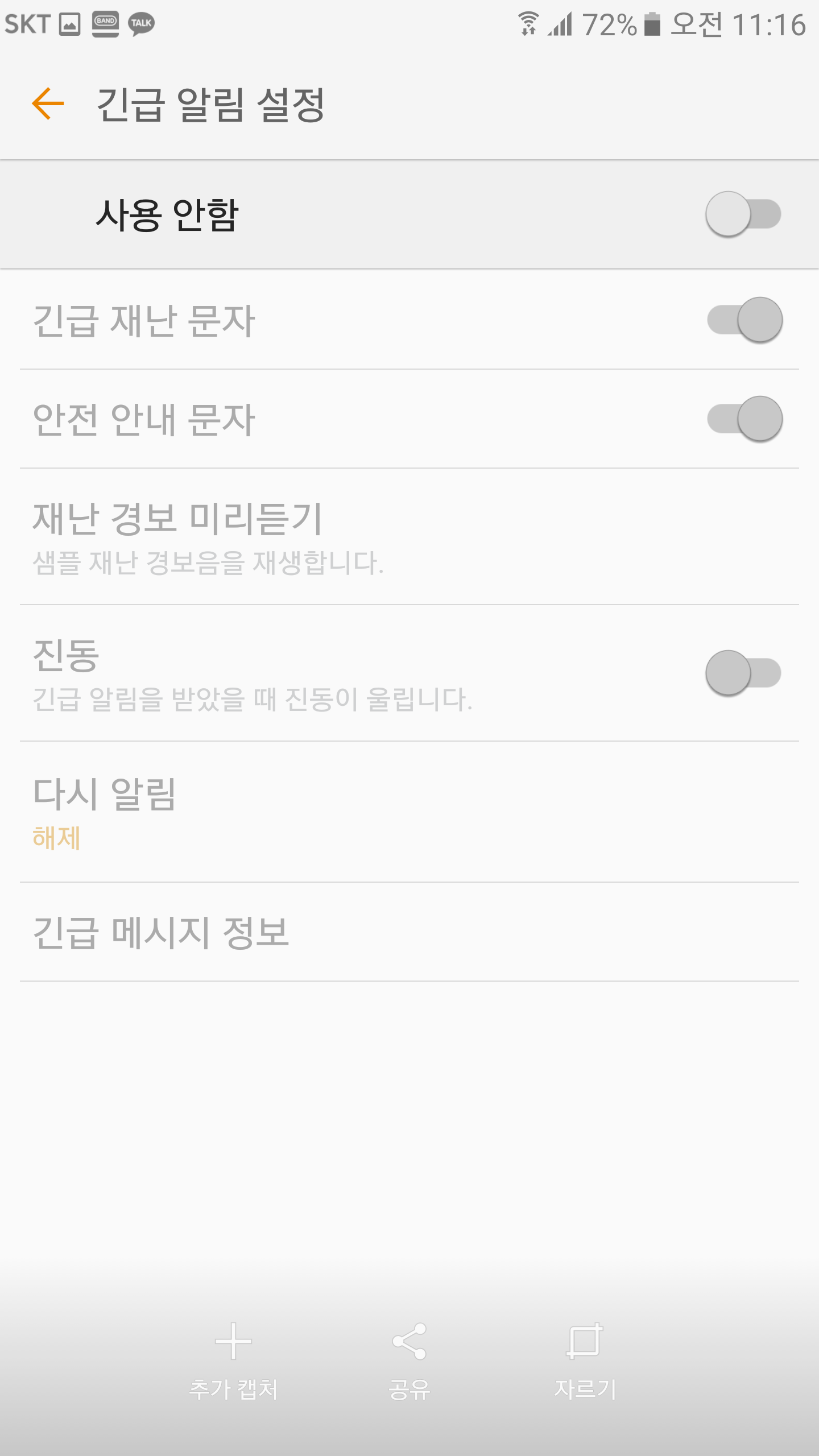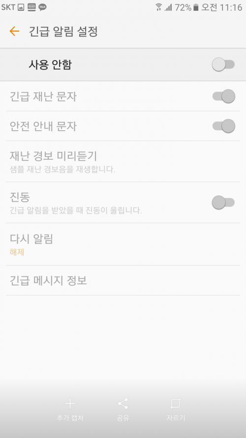 있어요. 문자설정인가에 보면 재난경보수신 해제하게끔 하는 옵션 있어요 | ||