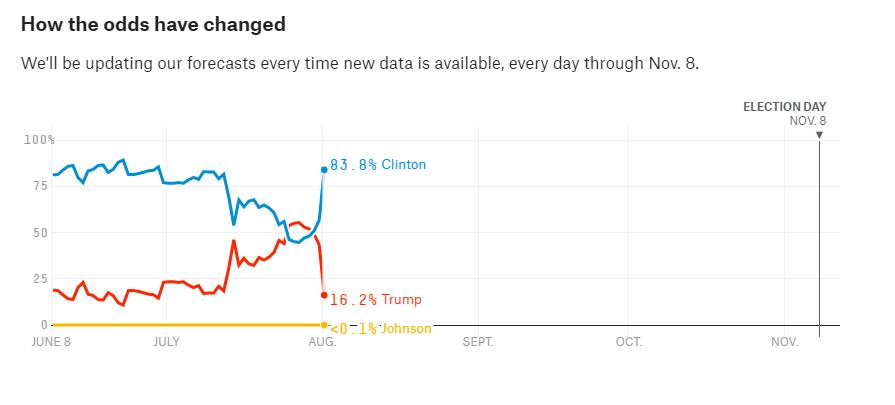 민주당 전당대회가 끝나고 트럼프가 또 한 번의 치명적인 자폭쇼를 하면서 급격하게 힐러리쪽으로 기울고 있다고 합니다.