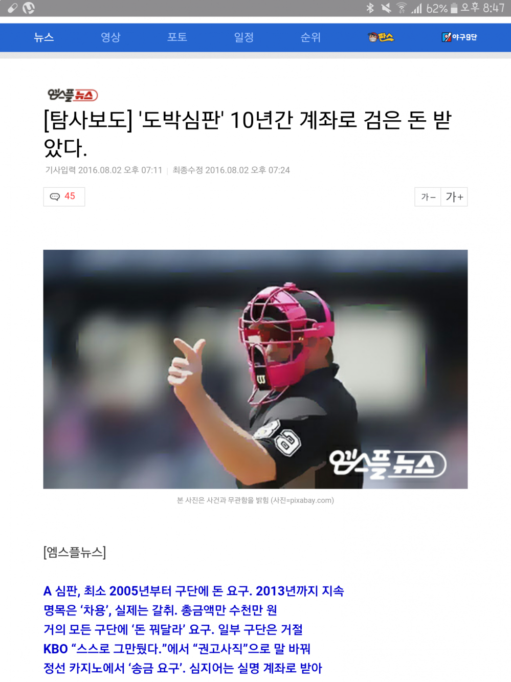 이게 어제뜬 기사였나 그랬는데 네이버는 일면에서 내리고 검색으로만 볼수있게 해놨죠. KBO에서 돈먹이고 막은건지 아니면 돈준 구단에서 막은건지 모르겠지만 말이죠. 요즘세상에 조금만 뒤지고 하면 다 나오는데 그걸 이런식으로 막아버리는 네이버 클라스란....참..