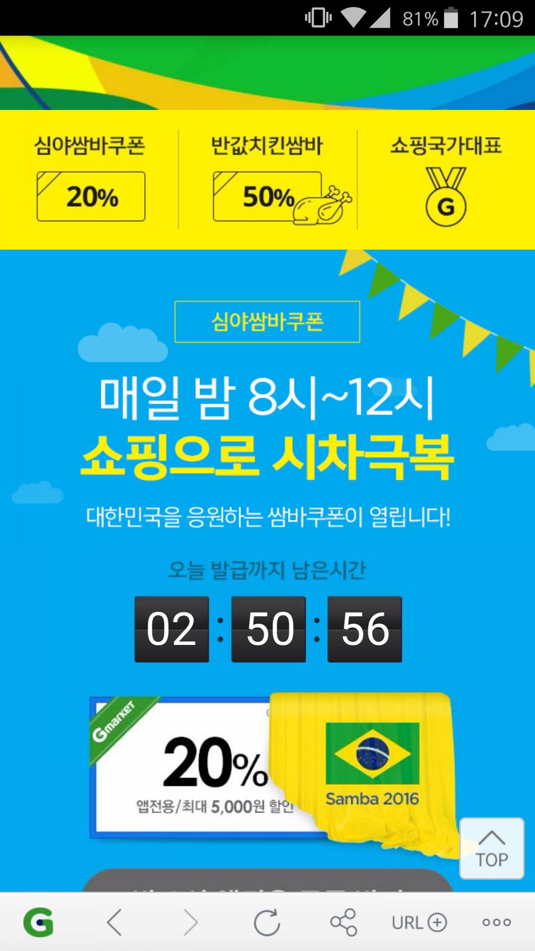 모바일로 4시 55분부터 대기하다가 삼바쿠폰 시간보니까 3시간남으면 5시길래 3시간 30초 남았을때부터 크롬 모바일로 추가메시지 안뜨게 하고 5시1분까지 광클하니까 성공했습니다 :)