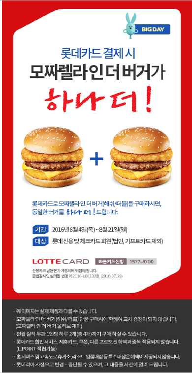 항상 가격이나 질로나 별로라고 생각하는 롯데리아인데.. 아래 행사로 사먹으니 나름 가성비도 글코 괜찮은 듯 합니다.