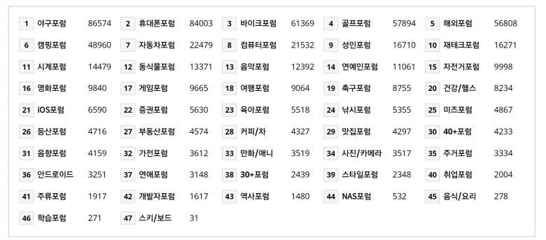 8위 컴퓨터포럼이 근소한차로 자동차포럼을 제치고 7위로