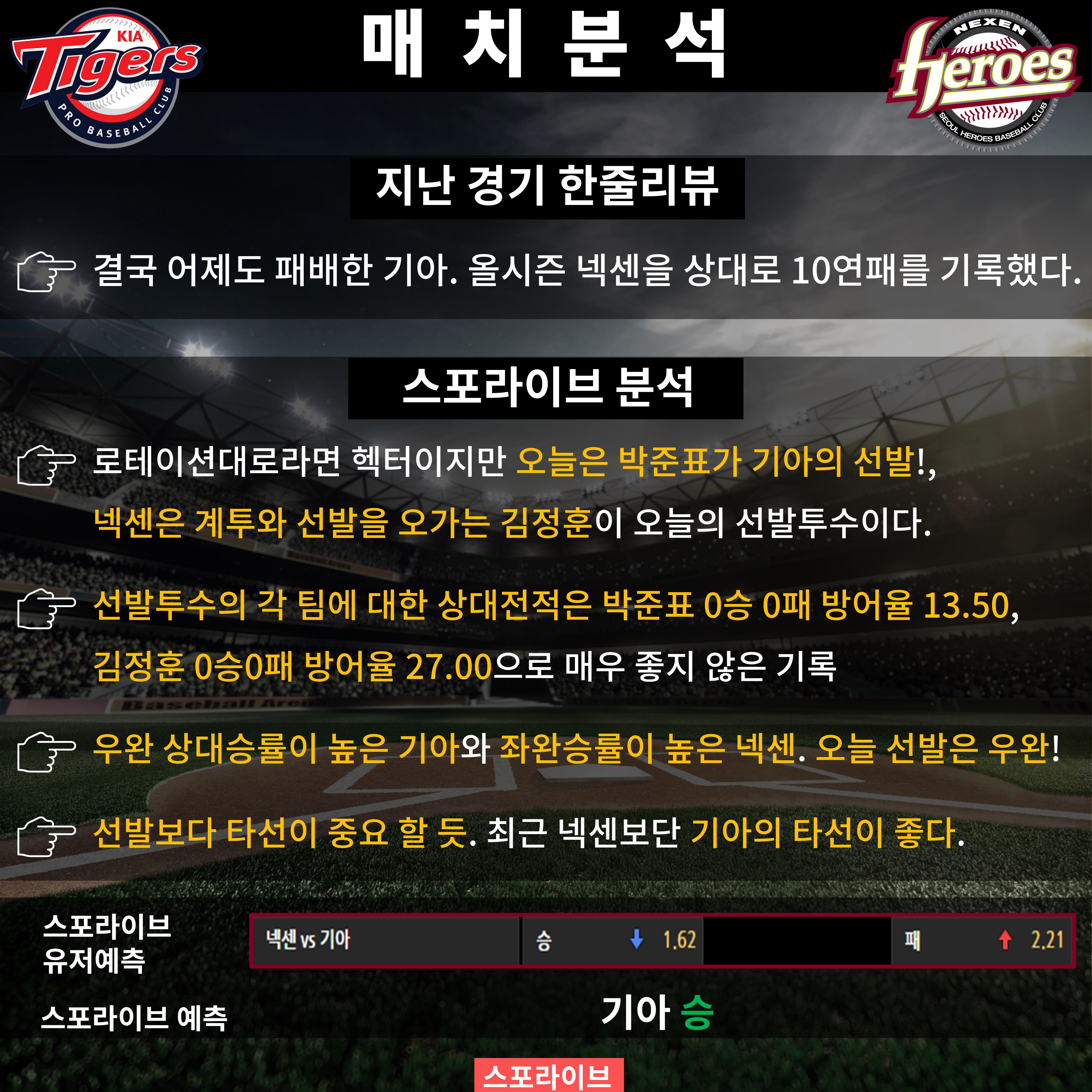 ㅜㅜ...기아는...무슨 넥센만 만나면...병이 도지는지...휴...아예 포기하고 있지만...5강 싸움 한참인데...휴... | ||