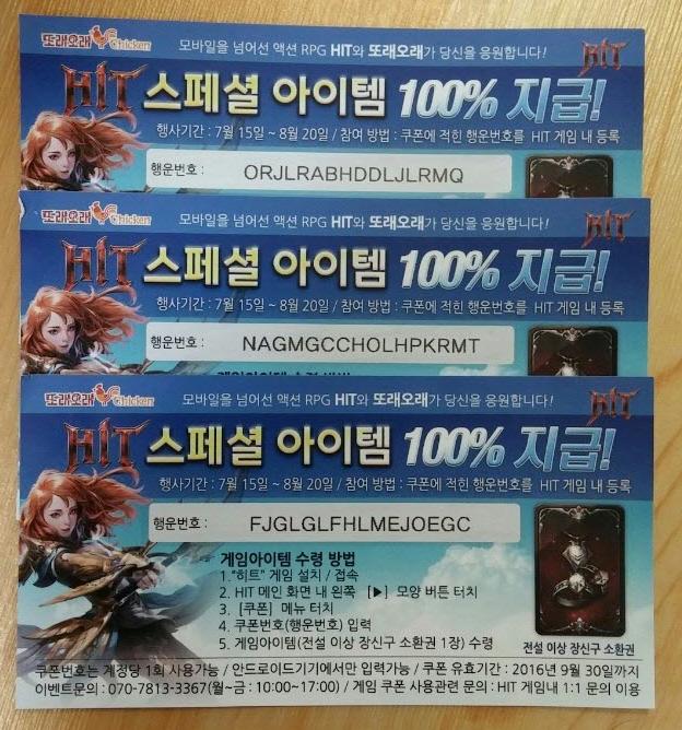 또래오래에서 주는 HIT 게임 아이템 행운쿠폰번호.