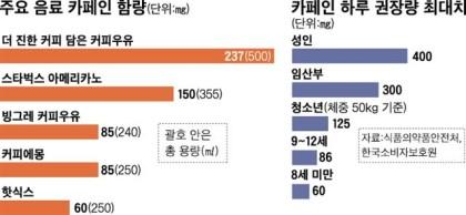 10. 청소년 카페인 과다 섭취 → 응답자 21%가 하루 2~3회 카페인 음료. 커피 우유에만 85mg. 식약처 기준 하루 125mg(몸무게 50kg). 음료에 경고 문구 필요.(한국) ▶숫자로 보는 ‘카페인’