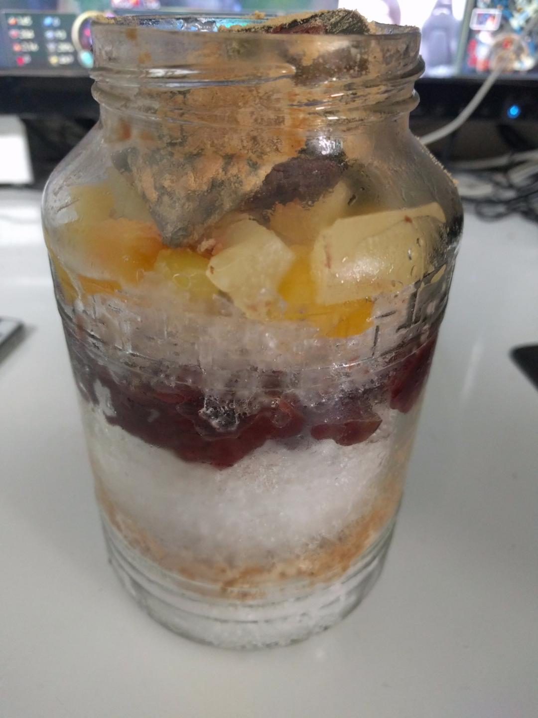 1층은 미숫가루 2층은 통단팥 3층은 후르츠칵테일+떡 하나 잘라넣었네요.