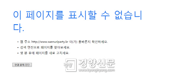 새누리당 홈페이지는 한 때 ‘시스템 점검중’이라는 문구가 뜨다가, 오후 6시8분 현재 ‘이 페이지를 표시할 수 없다’며 연결이 되지 않는 상태다.