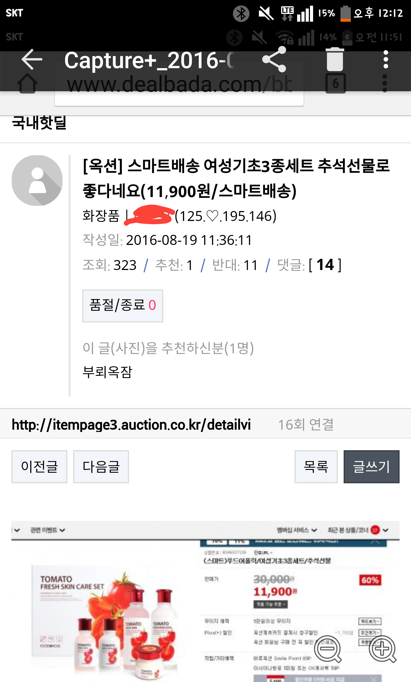 마트장 핫딜게시판 글 옥션 화장품3종