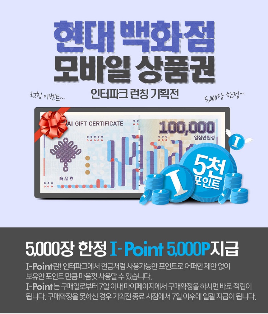 인터파크에서 현대백화점 상품권 10만원권 구매시 아이포인트 5000점 적립되는거 판매하고 있네요