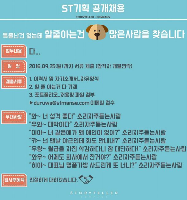 개인적으론 이미 끝난 광고라고 봅니다. 지원자 입장에서 이런 논란이 된걸 모르고 있을리도 없고, 설령 뽑혔다 한들 '내가 진짜 그런일이 있었는데, 왜 들어왔지..'라는 생각을 그만둘때까지 하지 싶네요. | ||