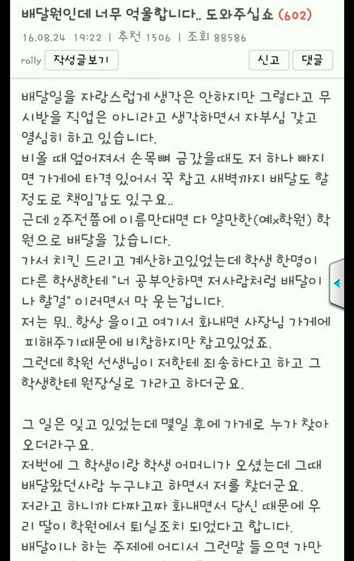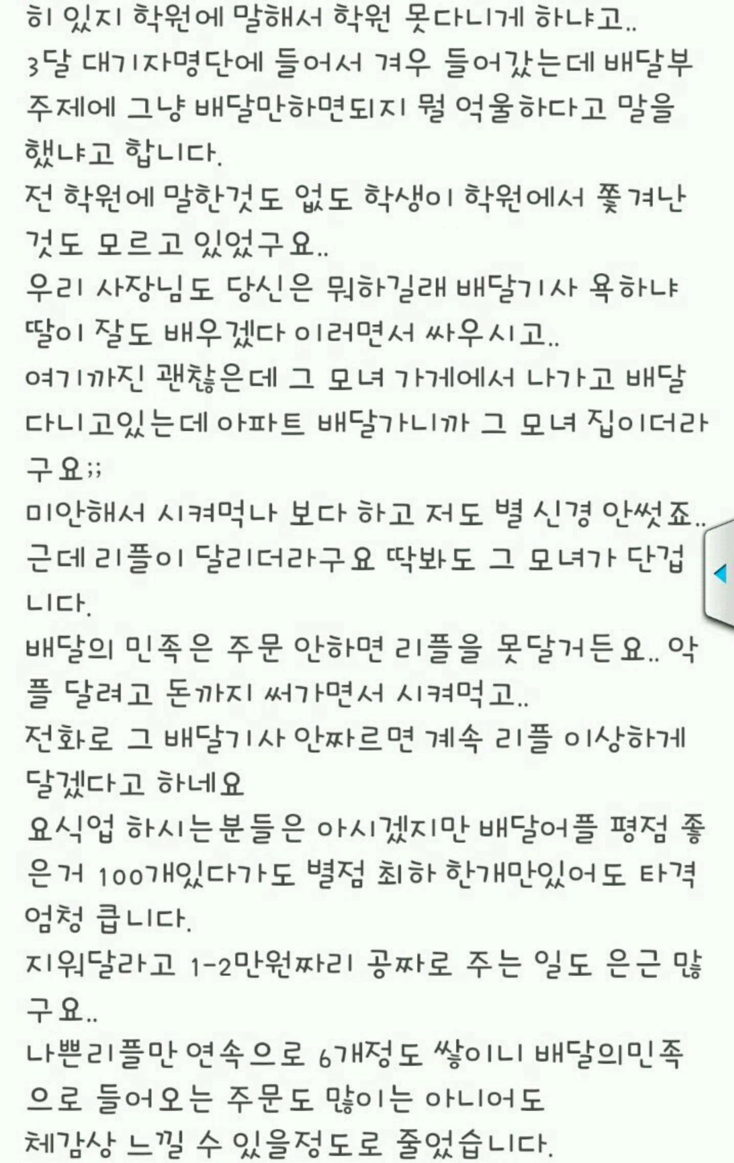 실제로 친구가게도와주면서 배달 몇번 해줬는데 별사람 다있어서 인터넷 이야기 다 믿게 되더라구요