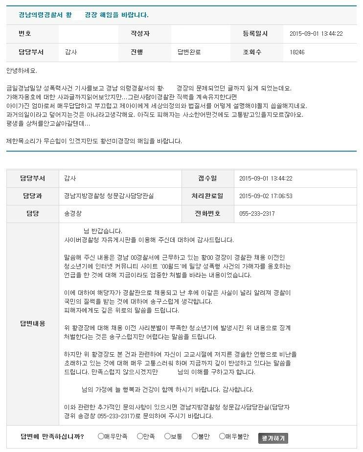 [보배펌] H경장 해임요청에 관한 경남경찰청의 답변 캡쳐. > 자유게시판